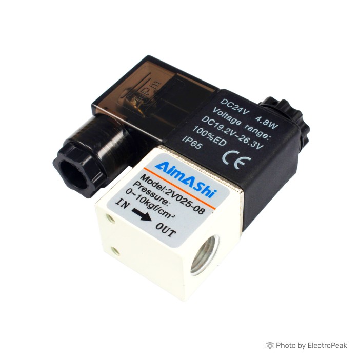 Direct acting 2-Way solenoid valve, normally closed, no minimum pressure required, connections with female thread G 1/4-19“, complete with push-in fittings for 6 mm hose, for 230 V AC. Special coil with low temperature rise. Many products in the market have rise in coil temperature in operation of 60 °C and more, 2V025-08 uses a special coil with 45 °C temperature rise only. This is an important feature when used for cooling in connection with easily inflammable liquids. This solenoid valve is widely-used in the control of air systems.